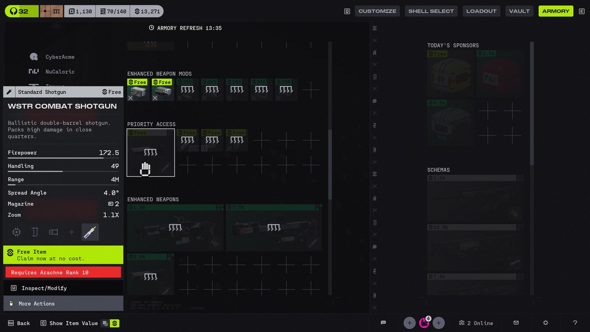 Среди доступных предметов замечены штурмовая винтовка M77 от Traxus, высокоуровневые ремонтные наборы и заряды щита от NuCaloric и даже дробовик WSTR от Arachne. Бесплатная двустволка – вещь, которую не нужно предлагать дважды, особенно учитывая, как она разносит всё на Крио-Архиве.