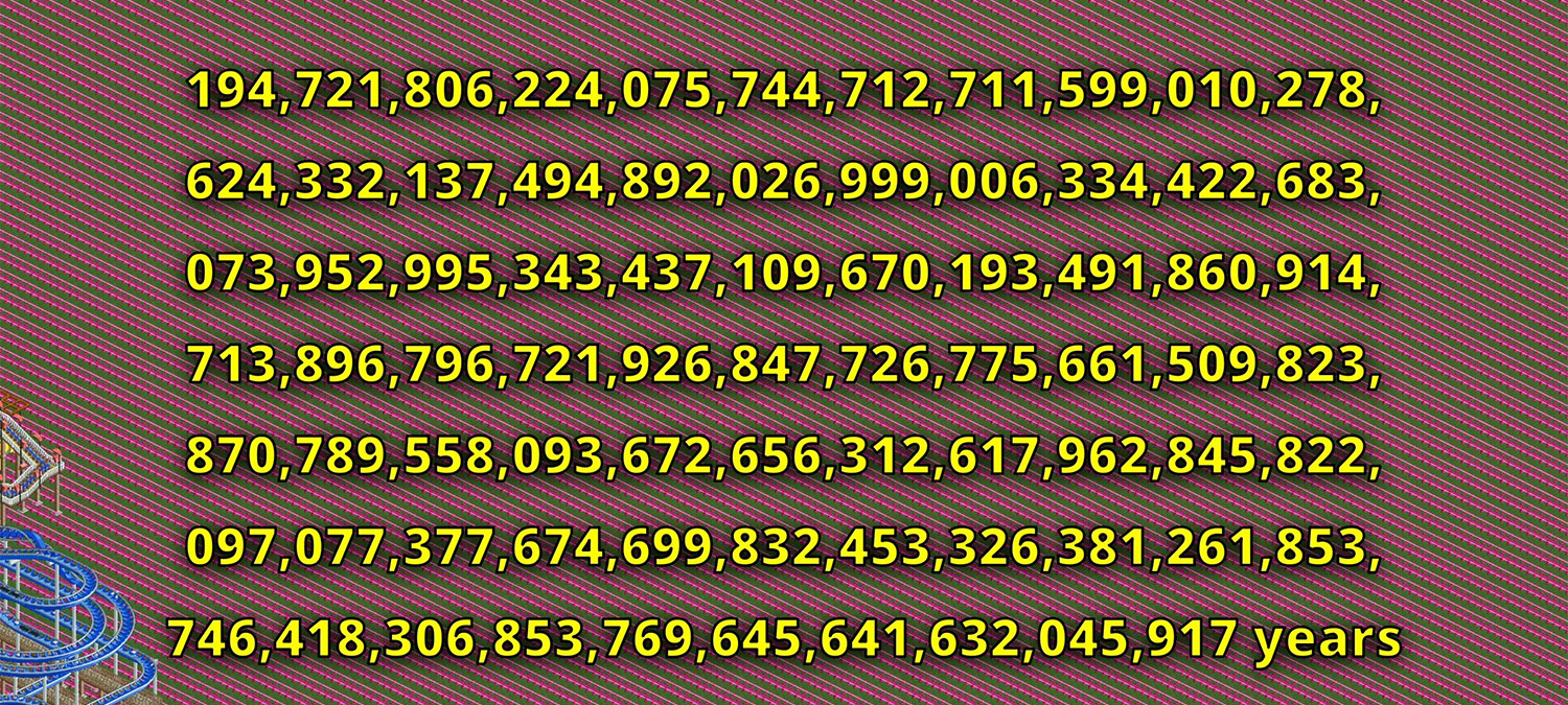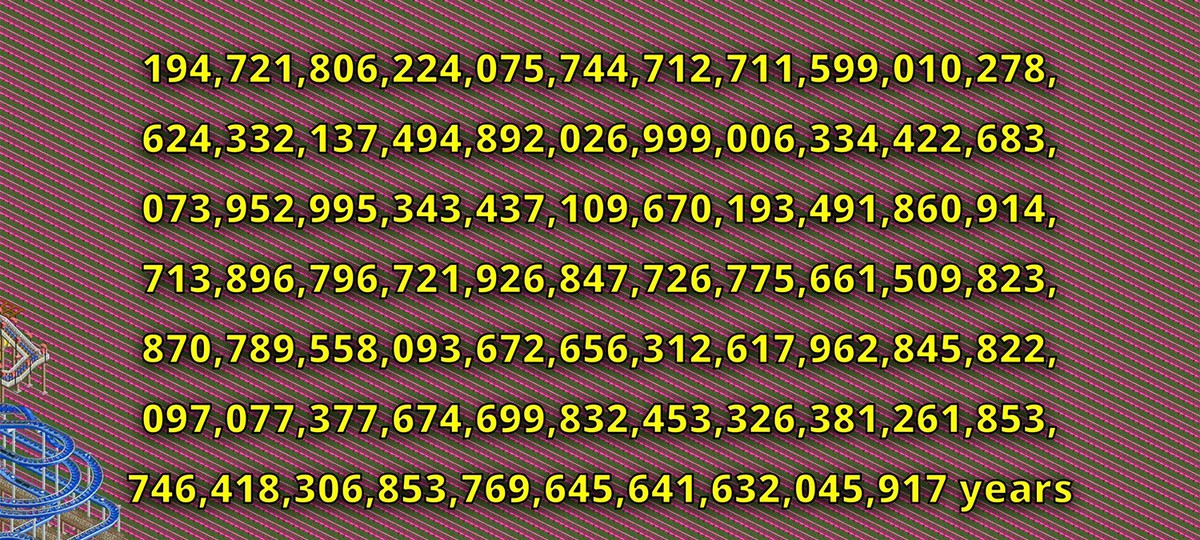 Ютубер Марсель Вос, известный своими экспериментами с RollerCoaster Tycoon 2, построил самый длинный аттракцион в истории игры. Поездка на его американских горках заняла бы 194 кваттуорсептуагинтиллиона лет – это примерно двойка с 227 нулями. Для сравнения, возраст всей Вселенной составляет около 13,8 миллиарда лет, что на фоне этого числа выглядит ничтожно.