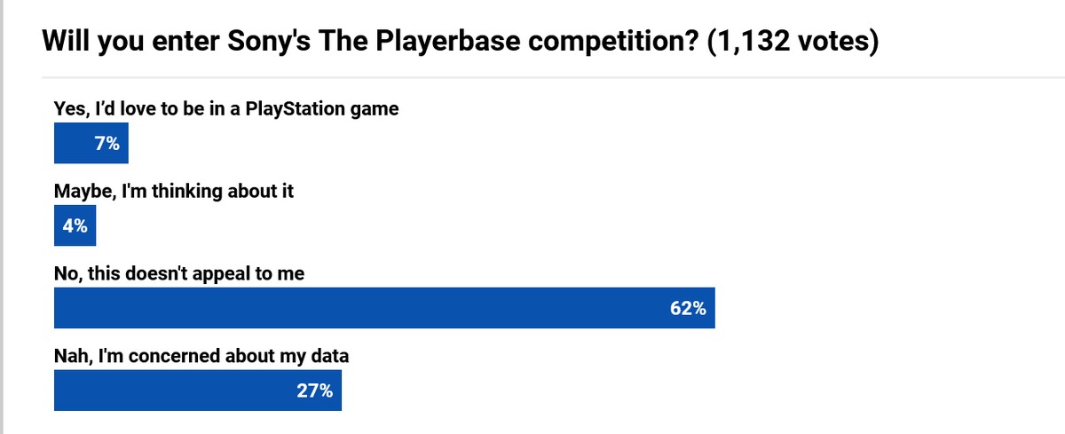 Согласно опросу, проведенному среди тысячи посетителей сайта PushSquare, колоссальные 62% респондентов заявили, что не заинтересованы в участии. Еще 27% высказали опасения относительно безопасности личных данных. Таким образом, почти 90% активных фанатов PlayStation (а сайт PushSquare специализируется на них) выразили скептицизм по отношению к программе, что выглядит провальным результатом для инициативы, нацеленной на празднование сообщества.