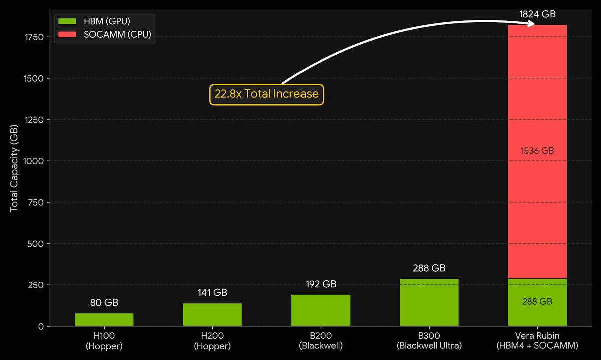 Если сравнить чистую ёмкость памяти от Hopper (H100/H200) до Vera Rubin с HBM4 и SOCAMM, разница составляет 22,8 раза – с выходом на 1824 ГБ суммарной ёмкости на ускоритель.