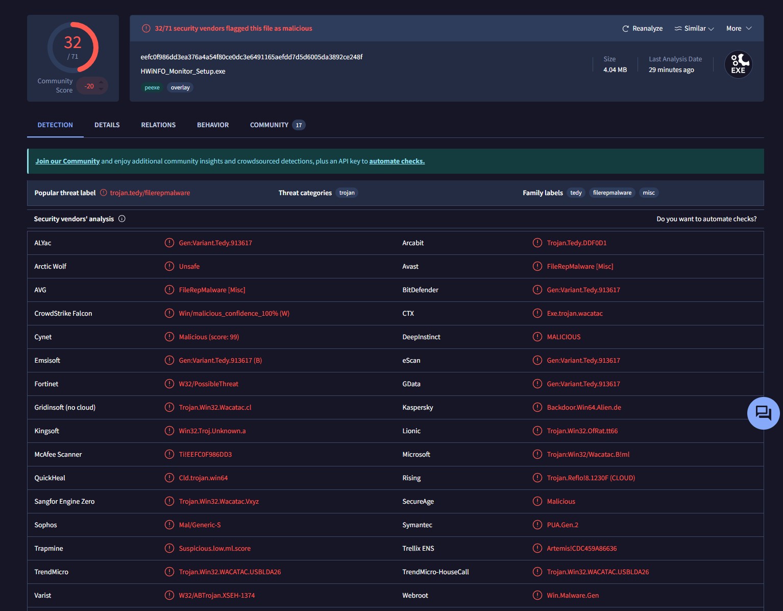 Проблему заметили пользователи, которые попытались обновить HWMonitor до версии 1.63 и вместо обычного файла с сайта скачивался установщик с именем HWiNFO_Monitor_Setup.exe – название, которое не используется разработчиком.