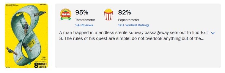 До сих пор самой высоко оценённой экранизацией видеоигры на Rotten Tomatoes оставался фильм Sonic the Hedgehog с рейтингом 86%. Таким образом, Exit 8 фактически занимает первое место в этом списке, хотя сам рейтинг платформы ещё не был официально обновлён, чтобы отразить этот результат.