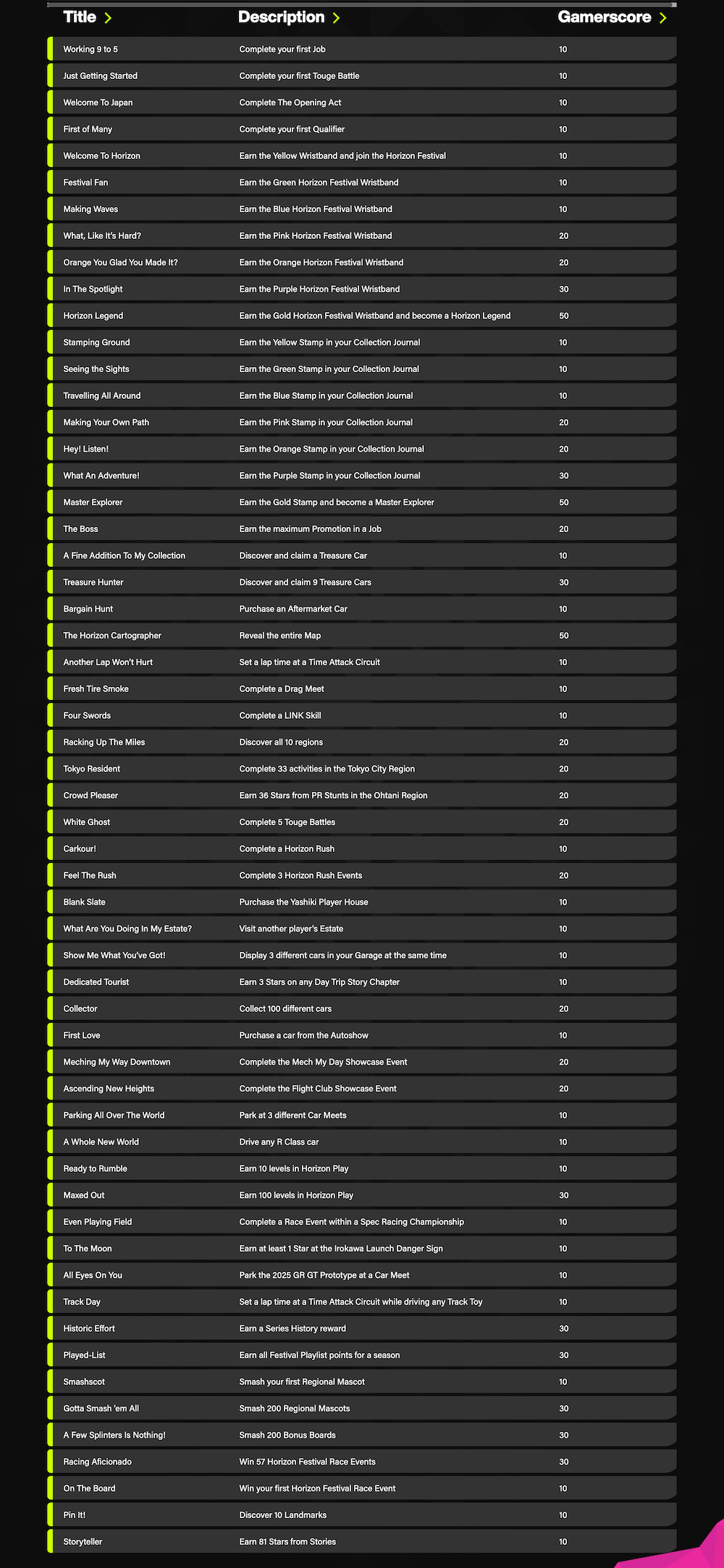 Достижения поощряют игроков за самые разные активности в открытом мире Японии. Среди них – получение новых браслетов на фестивале Horizon, сбор марок для коллекционного журнала, приобретение автомобилей, прохождение уникальных событий и участие в фестивальных мероприятиях.