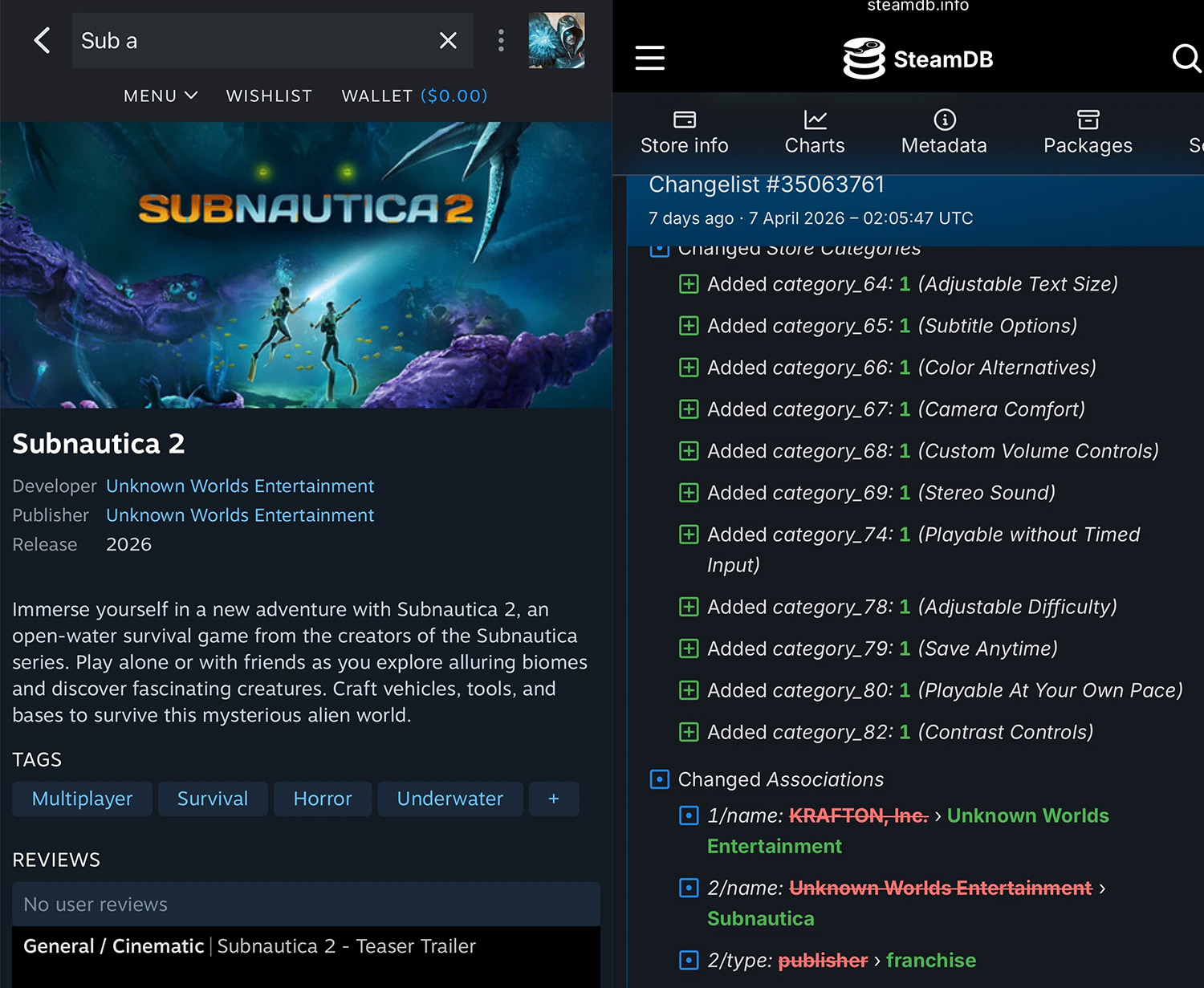 В затяжном конфликте между студией Unknown Worlds и издателем Krafton наметился новый поворот. Как заметил разработчик Майк Футтер в социальных сетях, в базе данных SteamDB изменилась запись о Subnautica 2: имя Krafton исчезло из раздела издателя, а на его место встала сама Unknown Worlds Entertainment.