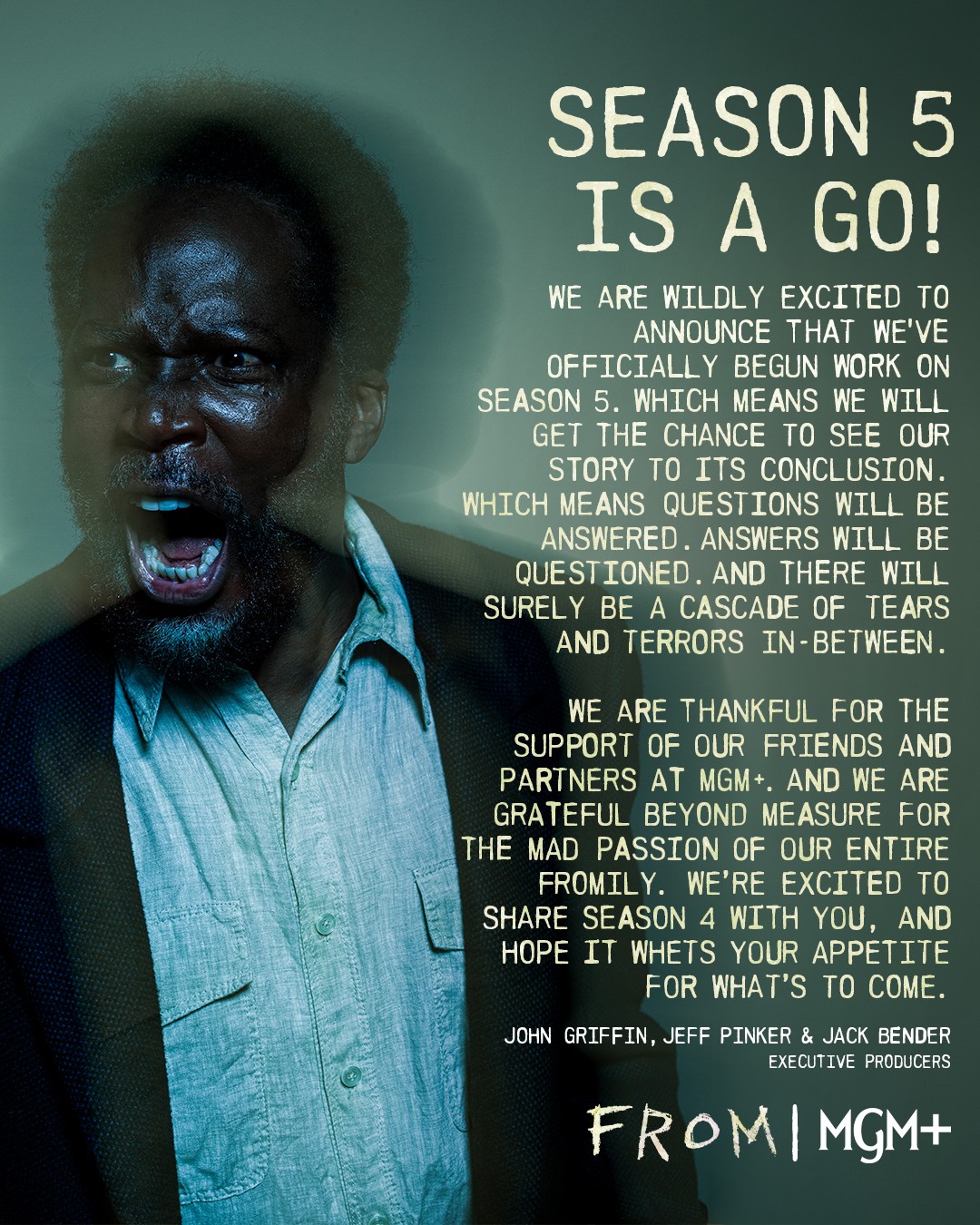Мы невероятно рады объявить, что официально начали работу над пятым сезоном. Это значит, что мы получим шанс довести нашу историю до её завершения. Это значит, что на вопросы будут даны ответы. Ответы породят новые вопросы. И между всем этим наверняка будет каскад слёз и ужасов.