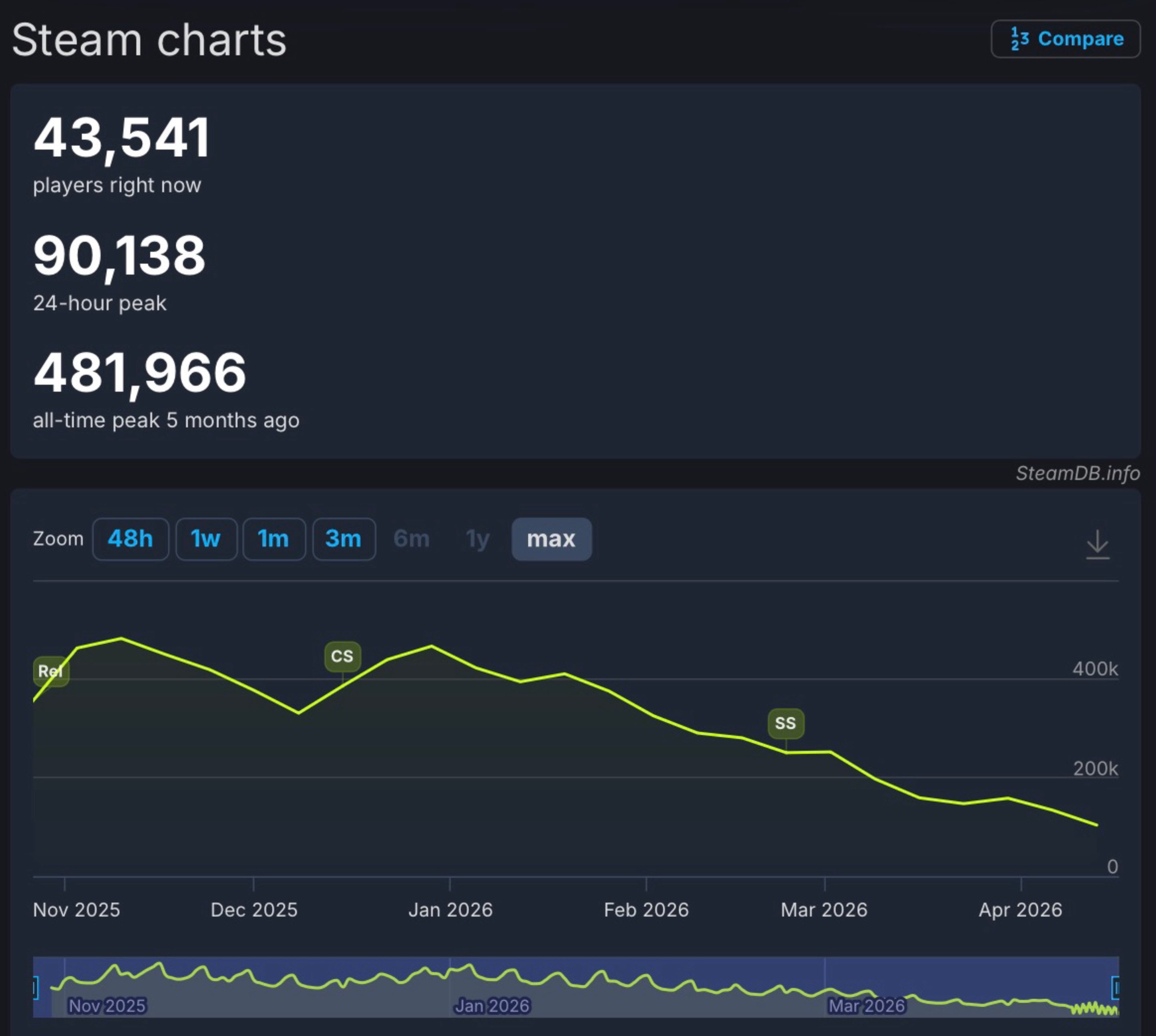ARC Raiders столкнулась с серьёзным оттоком аудитории. На пике популярности, сразу после выхода в ранний доступ, игра одновременно привлекала 466 000 игроков в Steam. Спустя четыре месяца онлайн стабильно держится в районе 80–90 тысяч человек, что означает падение примерно на 81%.