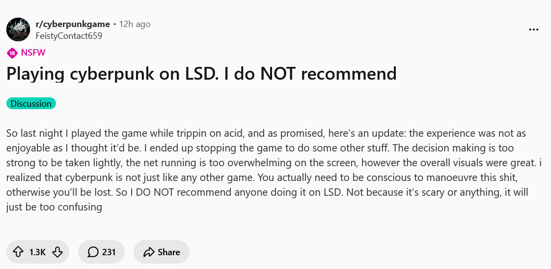 Один игрок попробовал поиграть в Cyberpunk 2077 под ЛСД и пожалел об этом
