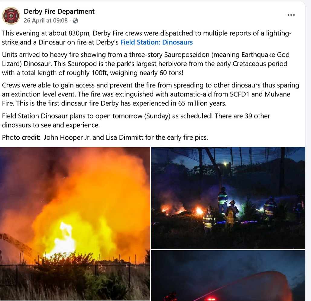 Пожарному департаменту Дерби удалось локализовать огонь и не допустить его распространения на другие экспонаты. Спасатели не удержались от шутки в официальном заявлении: "Это первый пожар с участием динозавра, который Дерби пережил за последние 65 миллионов лет". Там же добавили, что пожарные "не допустили распространения огня на других динозавров, тем самым предотвратив событие уровня вымирания".